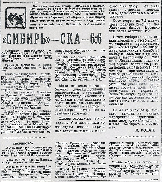 | По сравнению с Морозовым, Егоров просто няшка «Сибирь» (Новосибирск) – СКА (Ленинград) – 6:6 (3:1, 1:1, 2:4). 1 апреля 1979 г. Новосибирск. Дворец спорта «Сибирь». 8000 зрителей. Судьи: Н.Морозов, А.Баринов, С.Самойлов (все – Москва). Штрафное время: у «Сибири» – 24 мин. (Барабанов, Шамовцев – 6, Бакин – 4, Митраков – 6, Цеев, Яковлев, Перегоедов); у СКА – 10 мин. (Чистяков, Малюгин – 4, Маслов, Михайлов). Численное преимущество дважды реализовали сибиряки (Барабанов) и трижды – ленинградцы (Солодухин – два раза и Кузьмин). | |